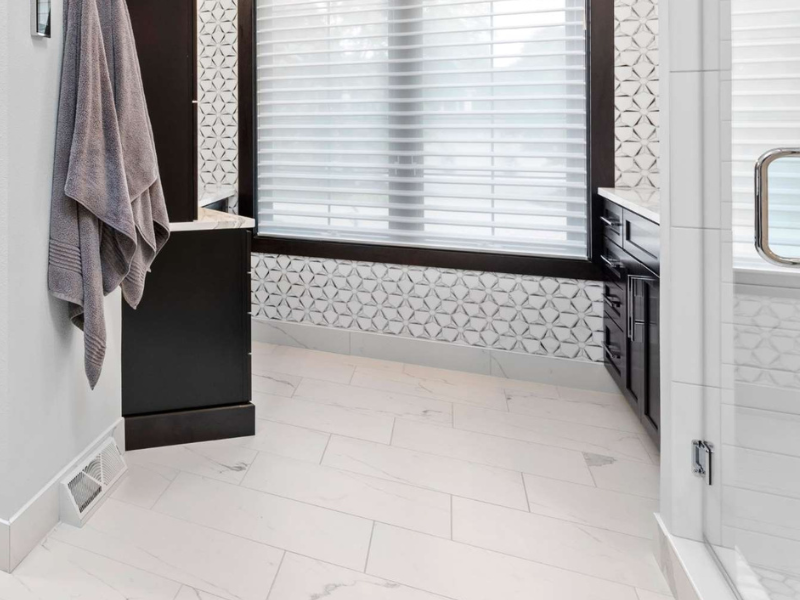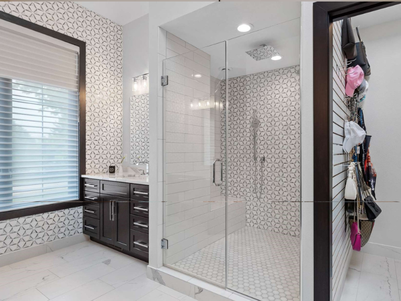 The new shower is no afterthought—it’s the star of the remodel. Built large enough for two, it combines luxury and technology. A digital keypad allows each user to customize their experience, from the invigorating spray of body jets to the soothing rainfall from a square ceiling-mounted shower head. A multifunctional hand shower on a slide bar adds flexibility, while a wide quartz-topped bench offers a place to sit back and enjoy it all.