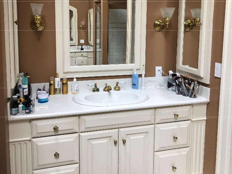 Both partners got what they wanted in the redesign. He now enjoys a spa-level shower tailored to his preferences. She has a makeup area bathed in natural light, complete with a countertop cabinet that hides a quad outlet for styling tools, wide drawers for hair appliances, and countertop doors that neatly corral cosmetics.